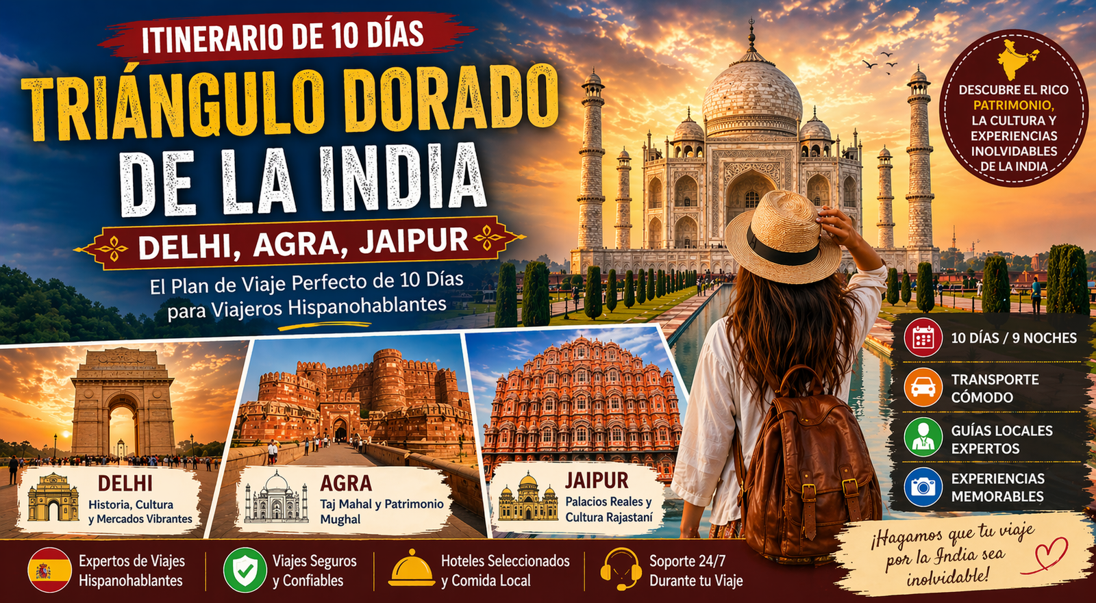 Si estás planeando tu primer viaje a India, el itinerario del Triángulo Dorado es la introducción perfecta. Cubriendo Delhi, Agra y Jaipur, esta ruta ofrece una experiencia completa de la historia, cultura y arquitectura de India. Este plan de viaje de 10 días por India está especialmente diseñado para viajeros de habla hispana que buscan...